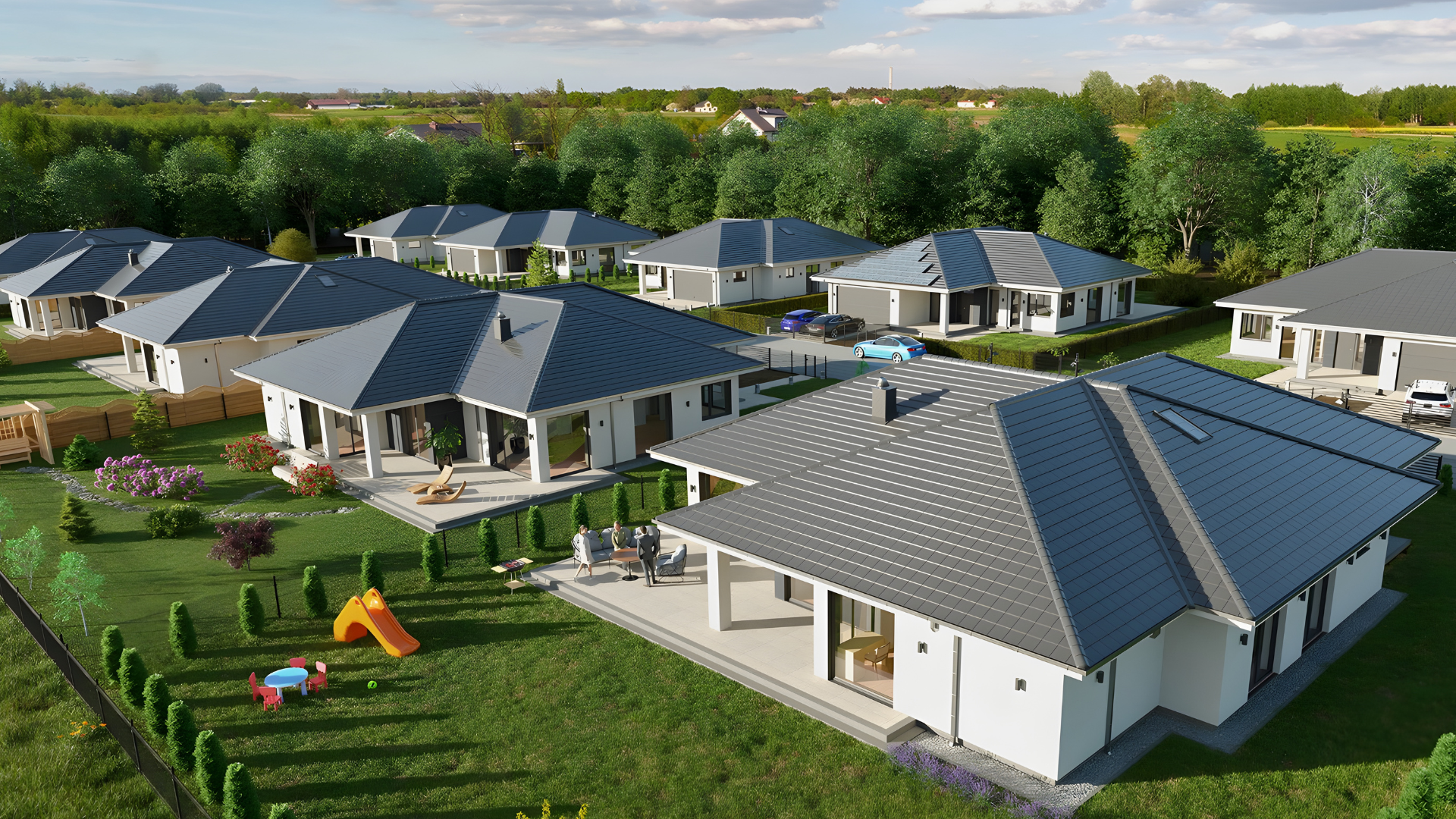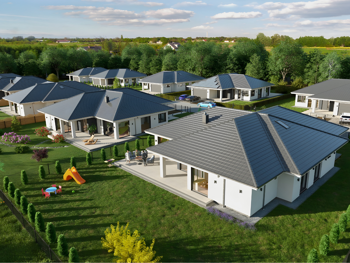 Poznaj osiedle w pełnej skali – z wysokości najlepiej widać układ ulic, prywatne ogródki i bliskość natury.